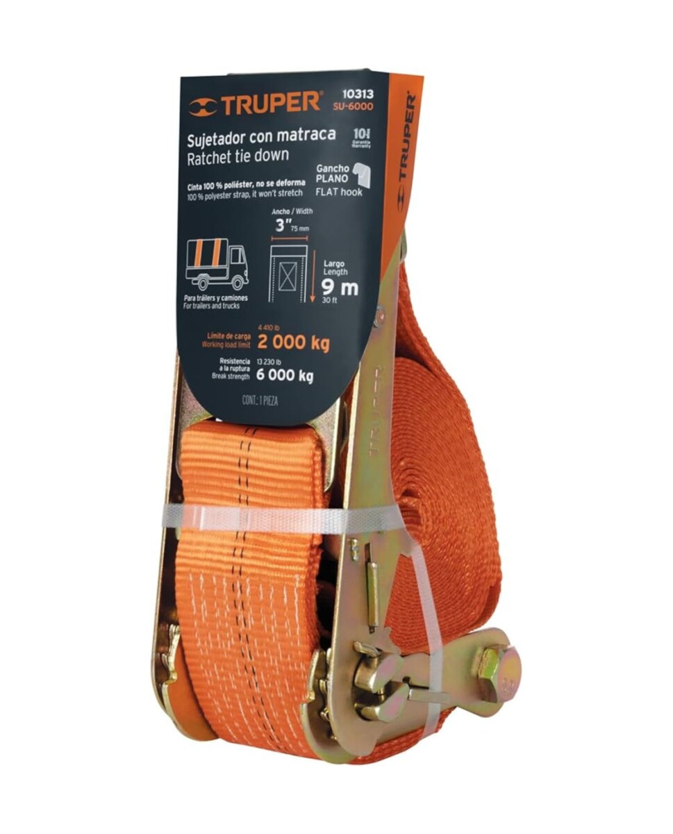 – Sujetador con matraca carga máxima 6,000 kg y cinta de seguridad 100% poliéster, no se deforma